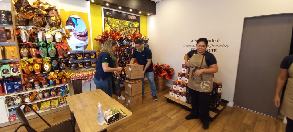 Neste dia (29/03/2023), a Empresa Cacau Show filial de Leme-SP fez uma doação deliciosa para nossos moradores, com a Chegada da páscoa a Cacau Show com o coração enorme doou caixas de ovos de chocolate, para que a pascoa de nosso abrigo seja fantástica.
